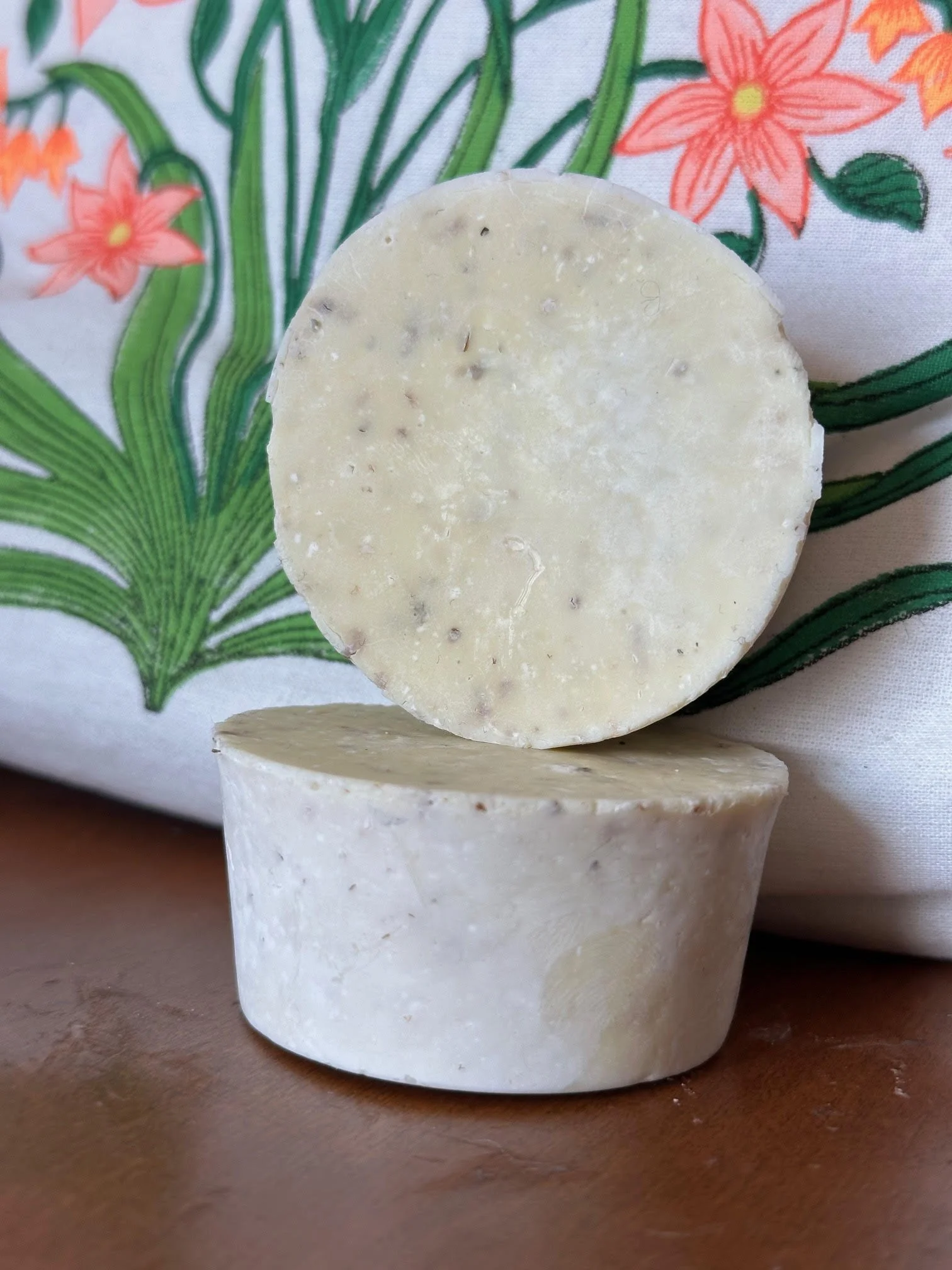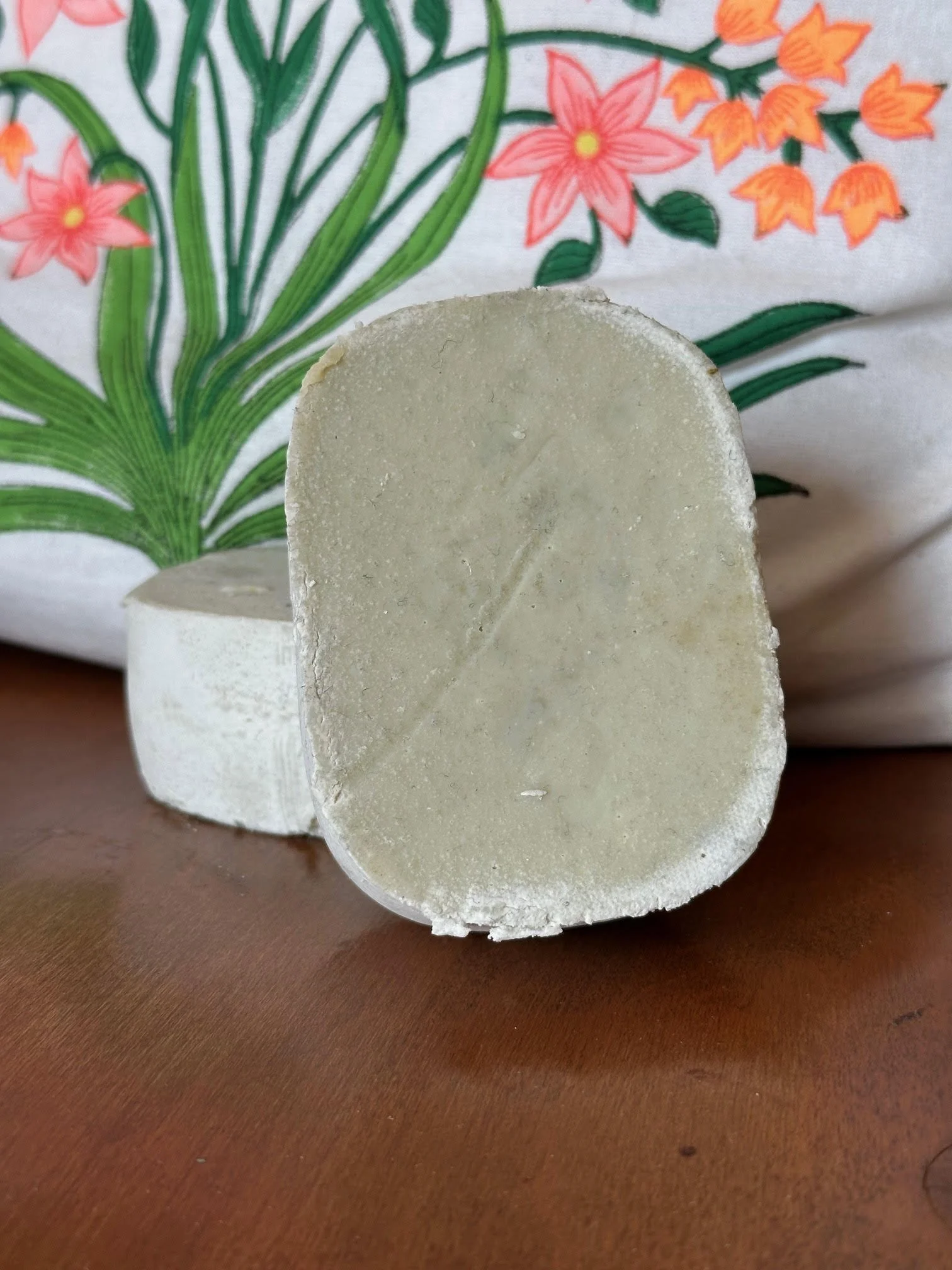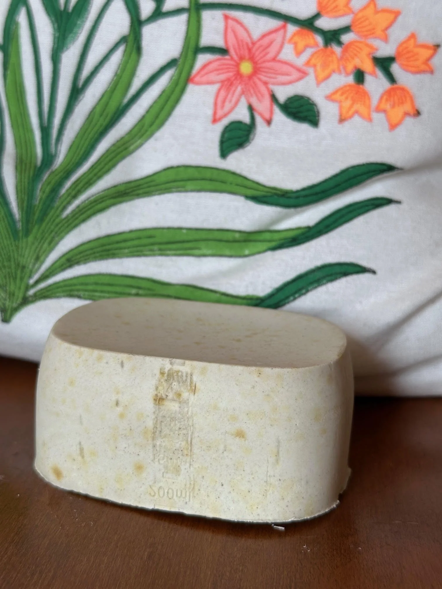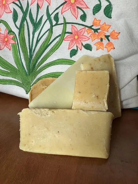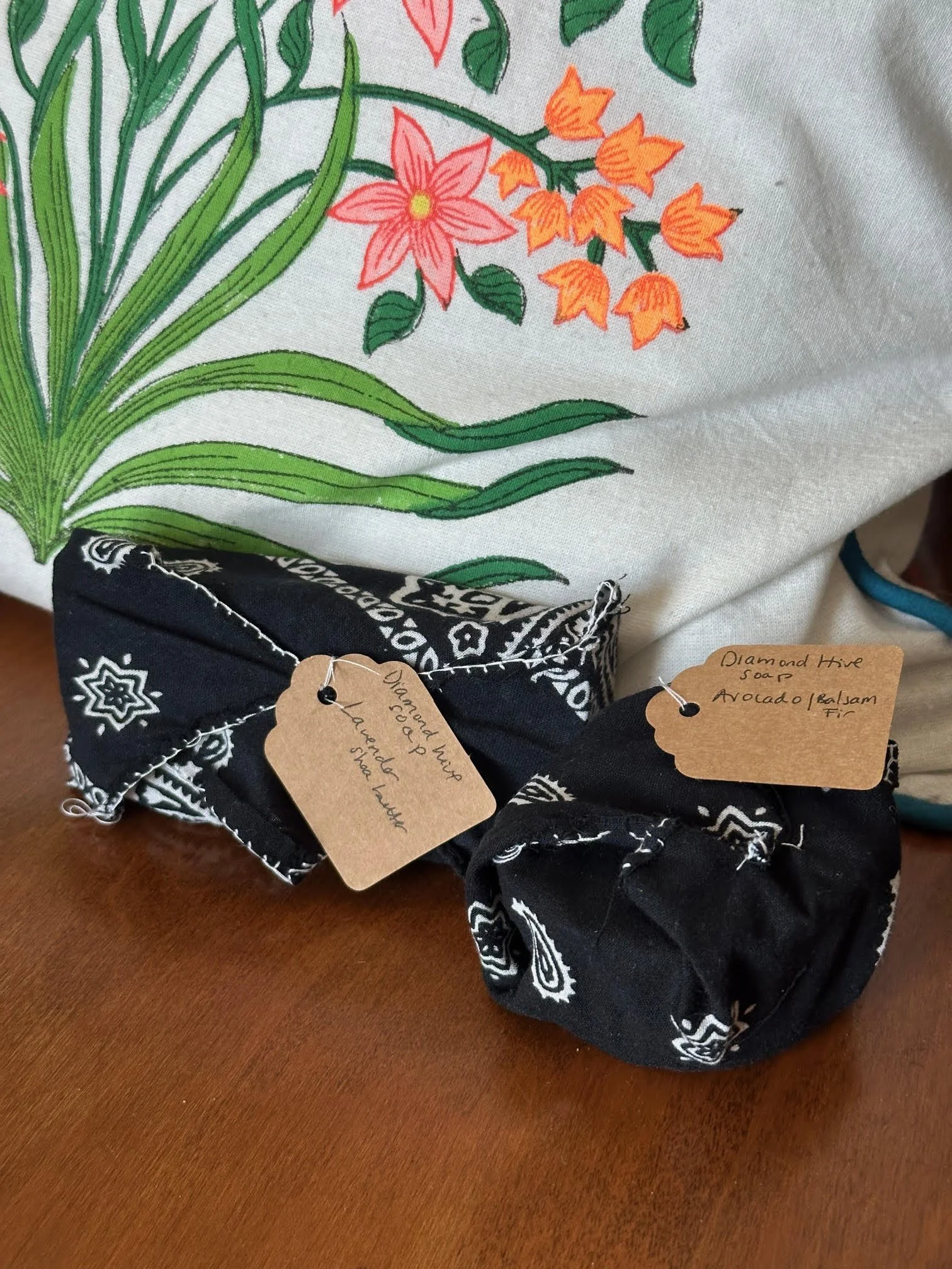 Each soap has been wrapped in my late father’s textiles, lovingly transformed into a mini handkerchief. We hope you enjoy both the soap and the hanky