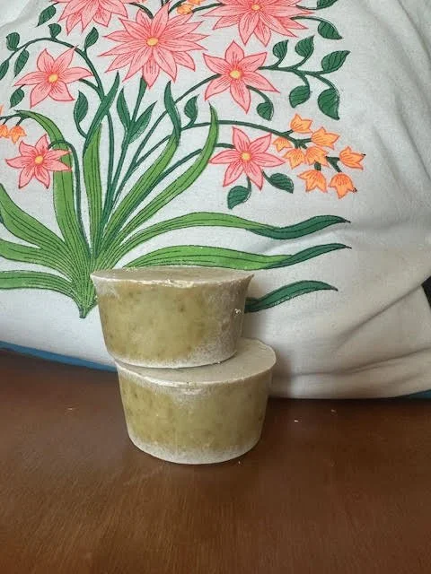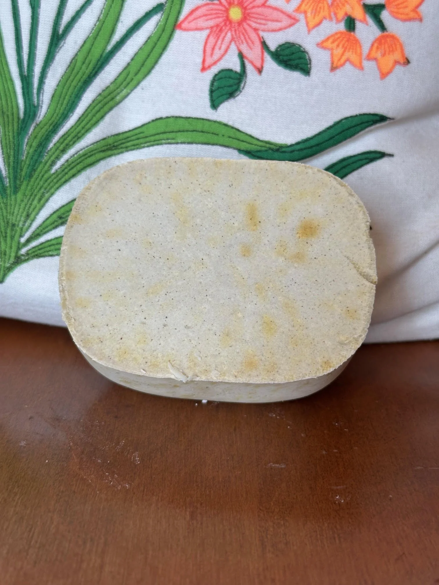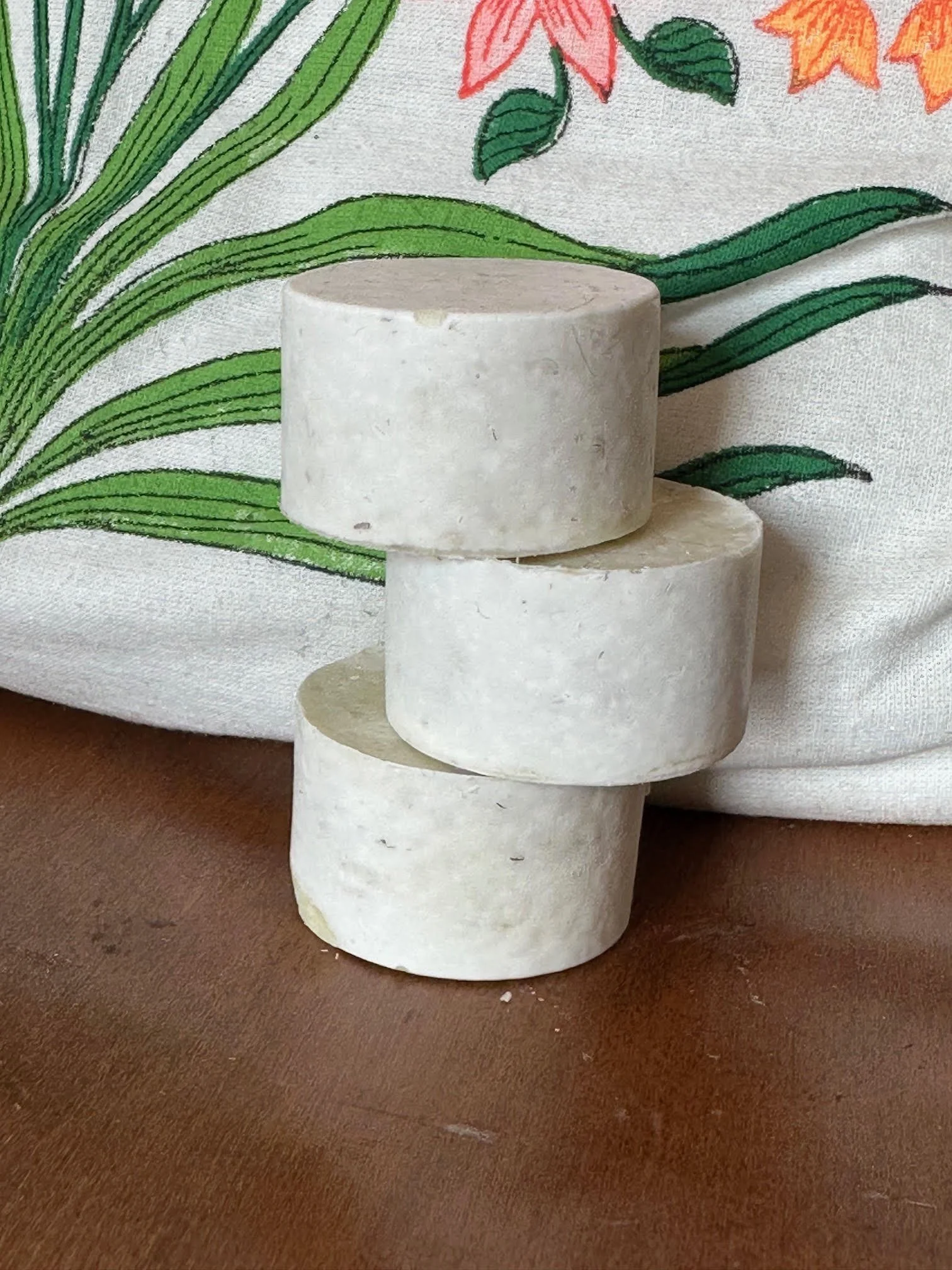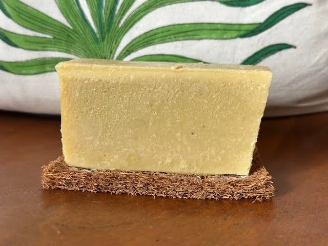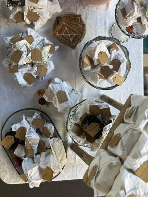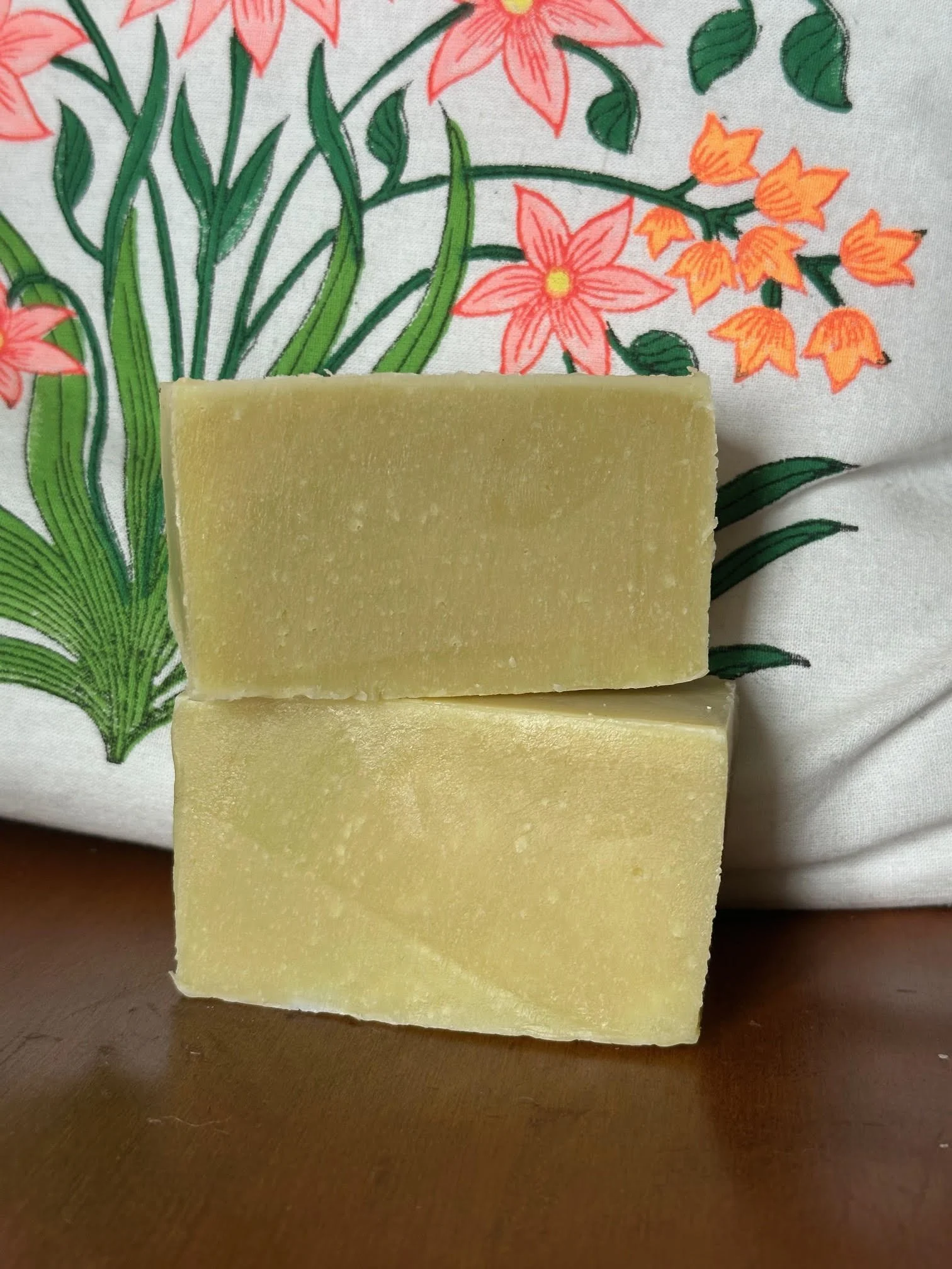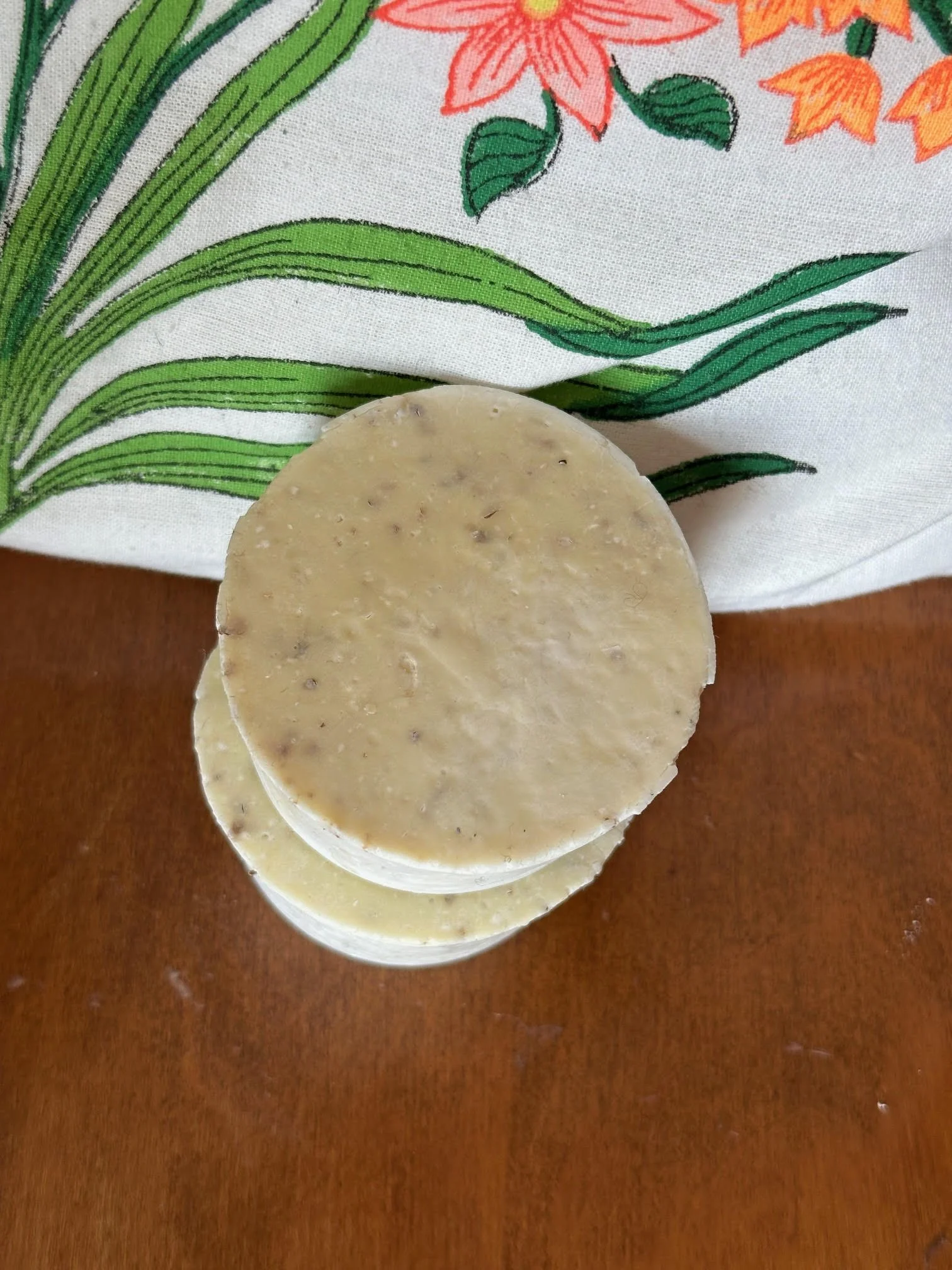 Each soap has been wrapped in my late father’s textiles, lovingly transformed into a mini handkerchief. We hope you enjoy both the soap and the hanky